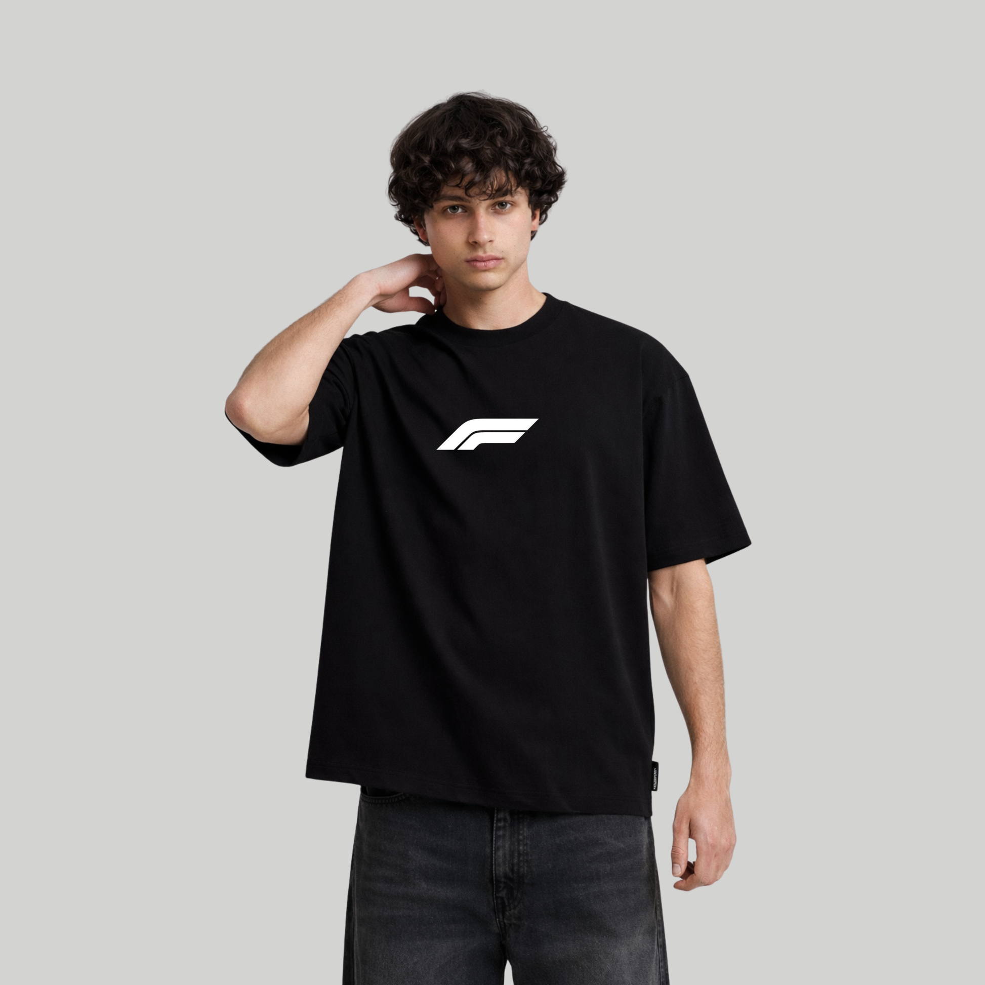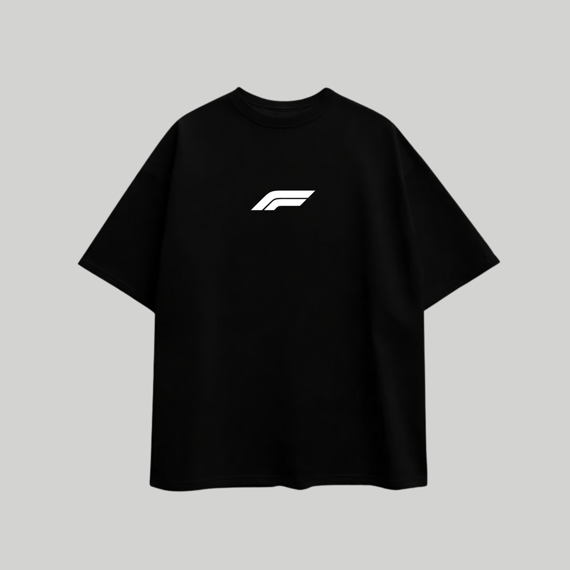 Premium 260 GSM heavyweight black motorsport t-shirt with oversized streetwear fit. Minimal racing logo design, durable cotton fabric.